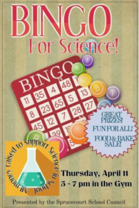 All money raised will support the Scientists in School program for all Sprucecourt students. Bingo and snacks for $1, pizza and raffle tickets for $2, or pay what you can.